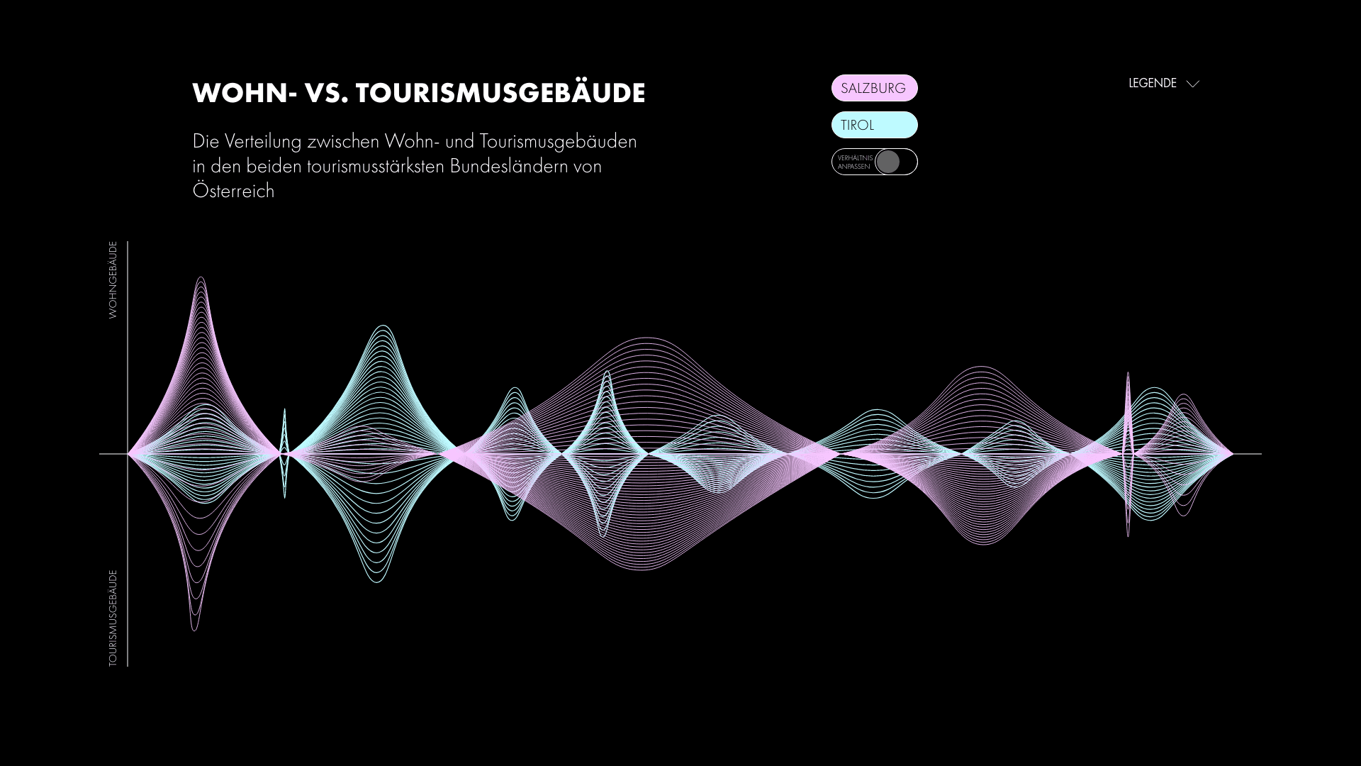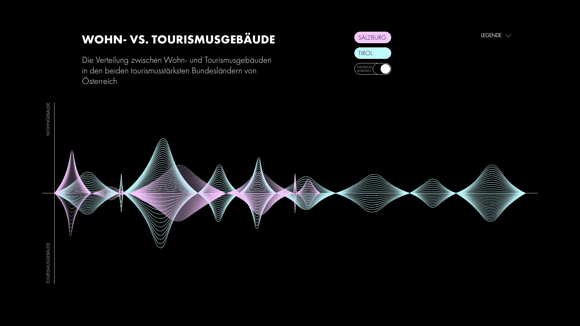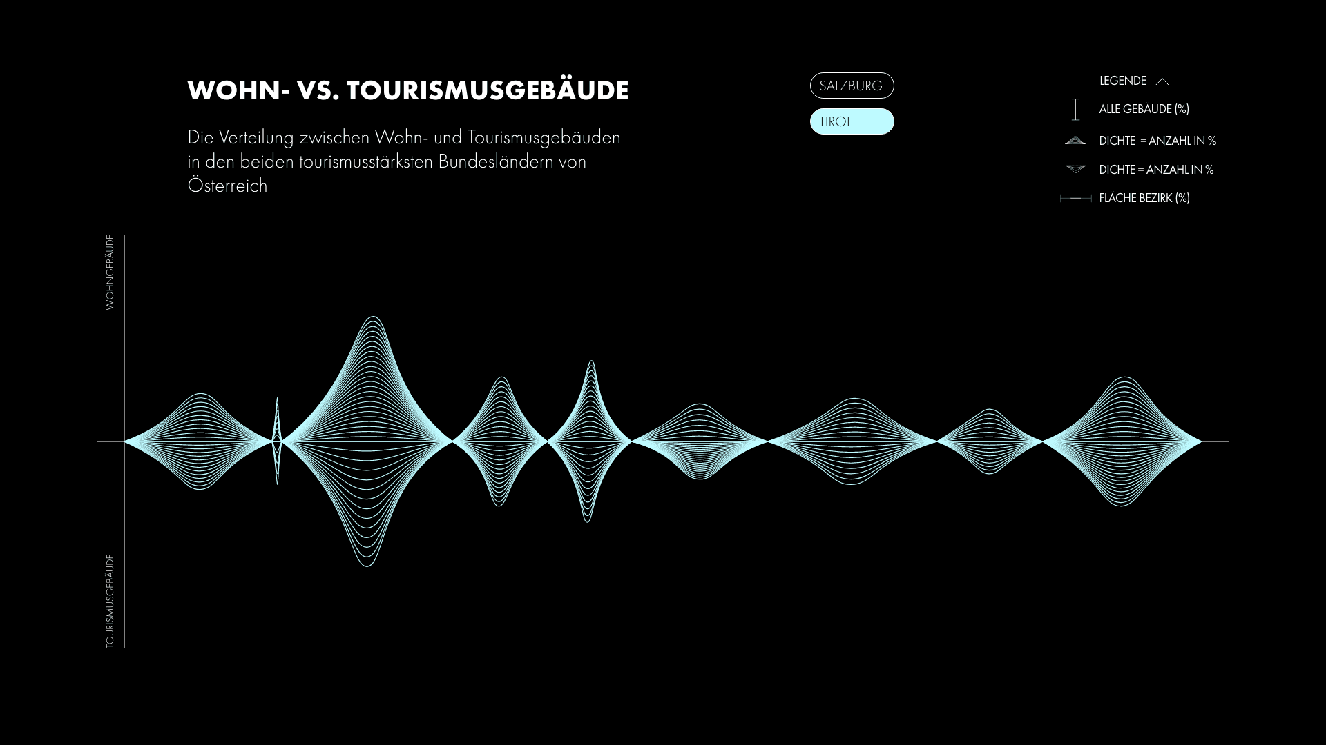 Diese Informationsgestaltung untersucht die Verteilung von Wohn- und Tourismusgebäuden im Verhältnis zum gesamten Gebäudebestand in den beiden tourismusstärksten Bundesländern Österreichs: Salzburg und Tirol. Ziel des Projekts war es, eine komplexe Datengrundlage visuell klar und verständlich aufzubereiten. Im Fokus stand der Vergleich zwischen regulären Wohngebäuden und touristisch genutzten Objekten – und damit die Frage, welchen strukturellen Einfluss der Tourismus auf die gebaute Umwelt dieser Regionen hat. Durch eine reduzierte, präzise Gestaltung wird die quantitative Verteilung nachvollziehbar gemacht und in einen größeren Kontext gesetzt. Die visuelle Hierarchie ermöglicht es, Unterschiede und Schwerpunkte auf einen Blick zu erkennen, ohne die Komplexität der Daten zu verlieren.